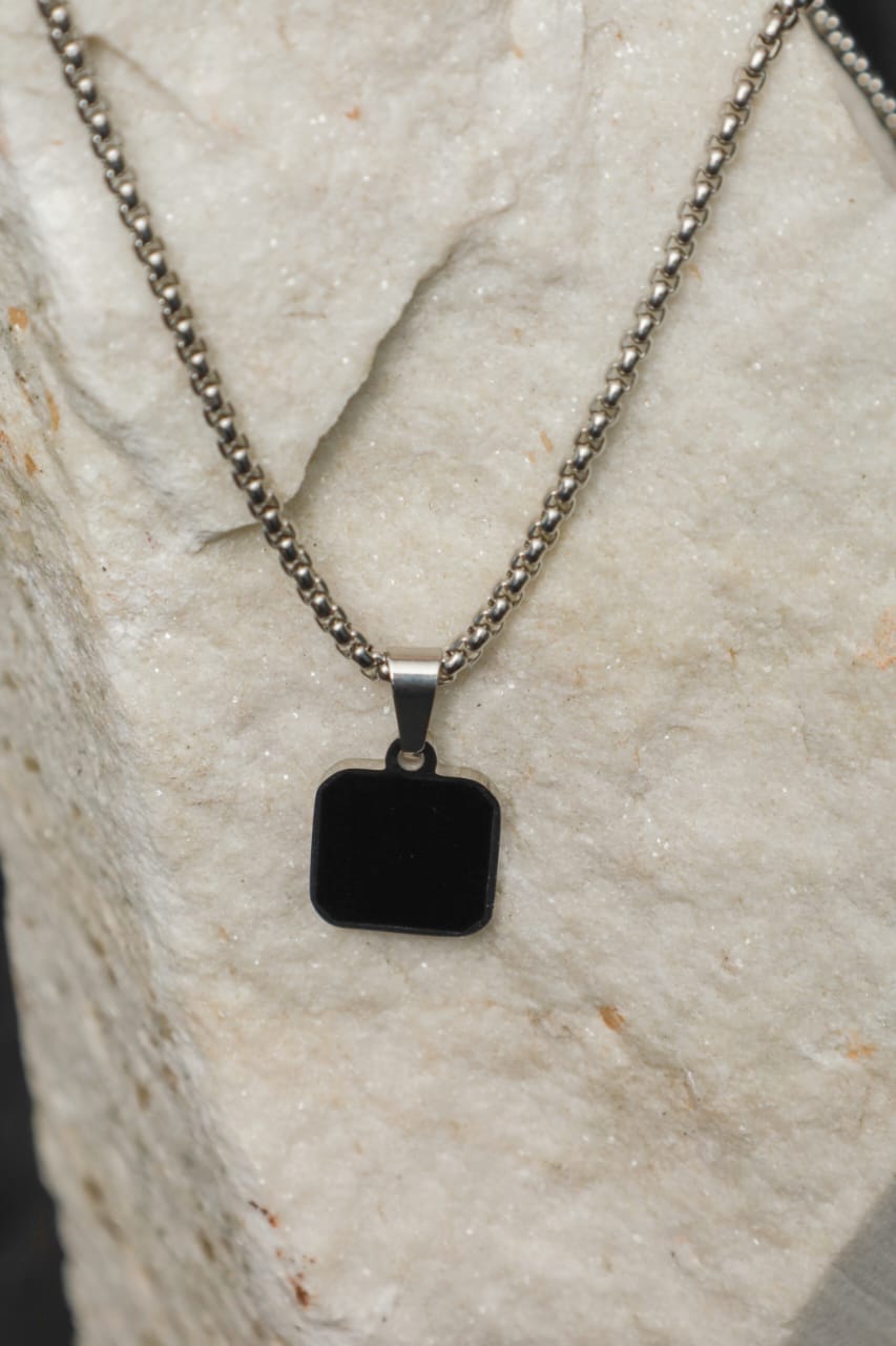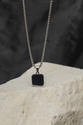Crafted from premium stainless steel, this necklace features a polished silver chain paired with a matte black square pendant, symbolizing confidence, focus, and inner strength.